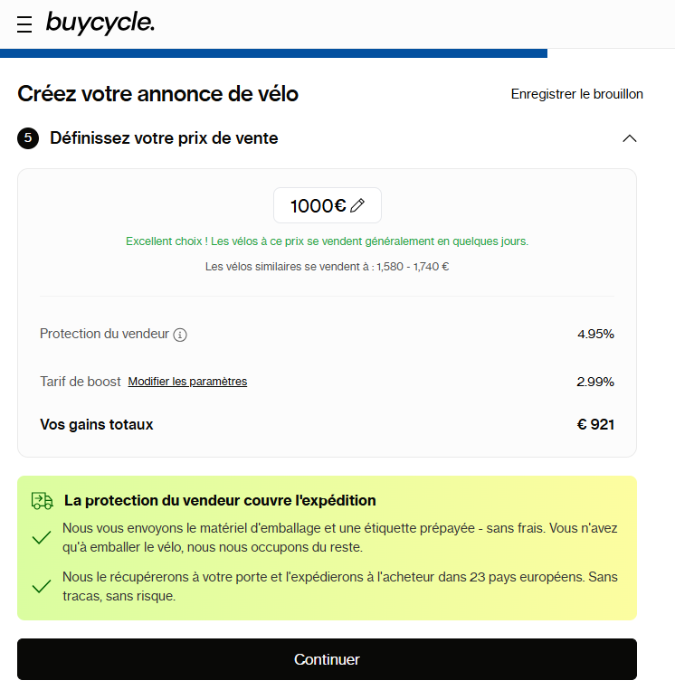 A cette étape sont calculés les frais de gestion: 4,95% du prix du vélo pour l'acheteur. Il est aussi possible de définir un Boost à 2,99% de la valeur du vélo.