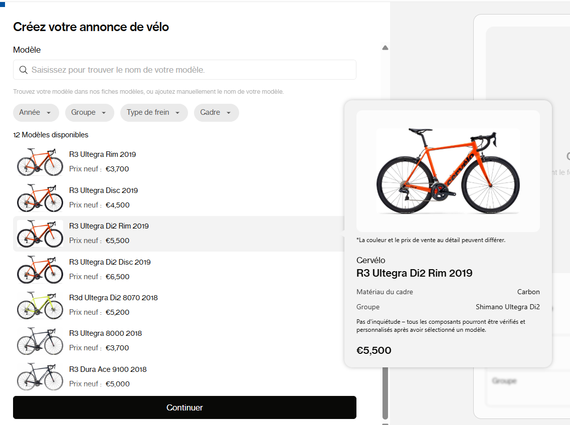 Lors de la première étape, on vous demande de choisir le modèle de votre vélo dans une liste prédéfinie ou d'ajouter vous même le modèle. En choisissant un modèle dans la liste existante, les champs techniques seront automatiquement compléter (ce qui n'empêche pas une vérification).