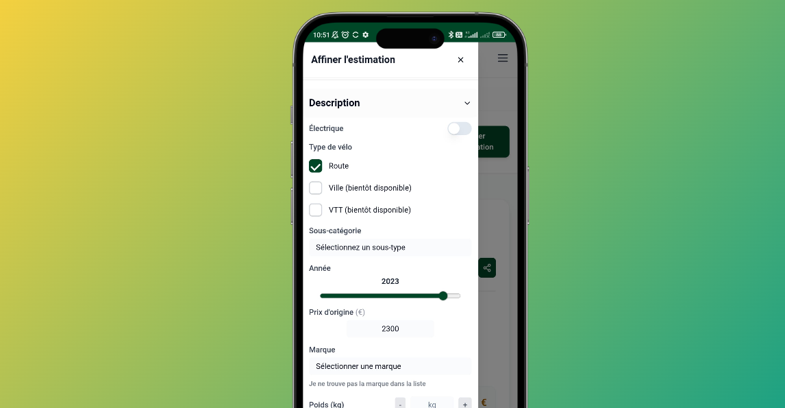 Draftly vous propose de procéder à une première estimation large de votre vélo (type de vélo, année, prix d'origine et état) avant d'affiner l'estimation avec ces filtres plus précis.