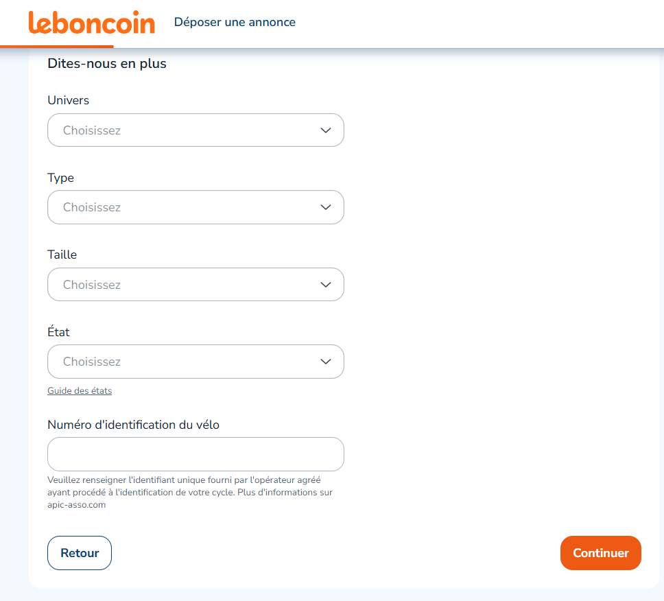Le Bon Coin est connu pour sa simplicité et on retrouve cela lors de la création d’une annonce. L’avantage du peu de filtre existant sur l’interface est que côté publication, il n’y a pas beaucoup de champ à compléter et peu sont obligatoires. En quelques étapes, l’annonce est prête. La partie description est la plus longue car pour bien vendre un vélo, il faut décrire précisément les composants et l’état.
