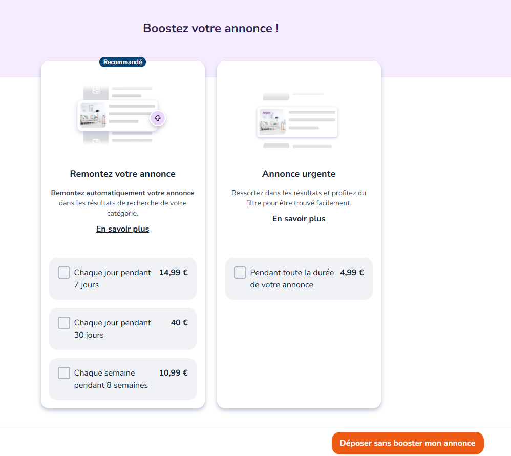 Lors de la dernière étape est proposé différentes options payantes pour mettre en avant son annonce et la catégoriser comme urgente.